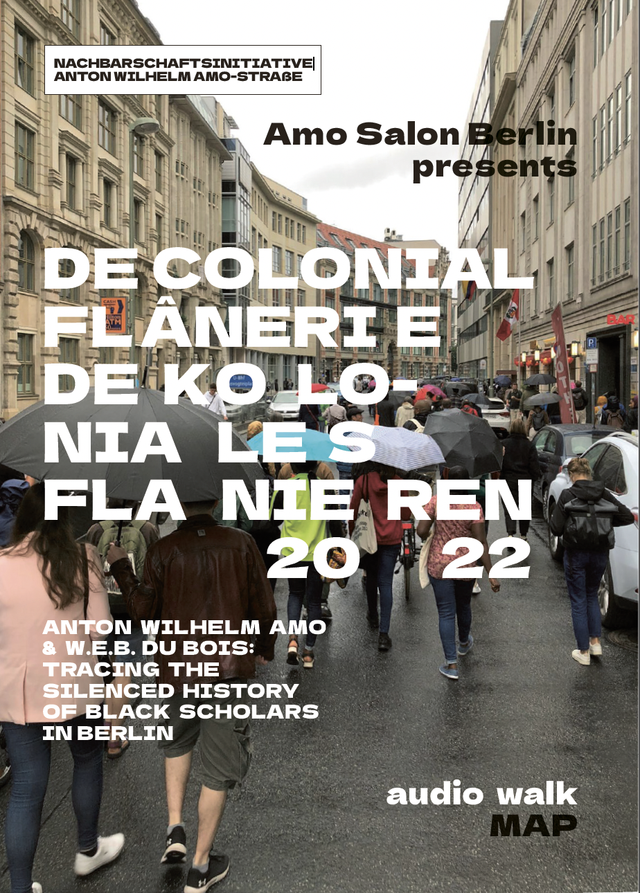 The focus of Decolonial Flânerie 2022 was to “trace the silenced history of Black scholars in Berlin”. It is organized around a fictive dialogue across the centuries between two prominent thinkers and their unique contribution to scholarship in Germany and globally: Anton Wilhelm Amo, an Afro-German Enlightenment philosopher of the early 18th century who taught at the universities of Wittenberg, Halle and Jena, and W.E.B. Du Bois, an African-American sociologist, philosopher, and civil rights activist of the late 19th and early 20th centuries with close ties to the German sociologist Max Weber. Both critical Black scholars – Amo and Du Bois – made early contributions to anti-racist thought in German philosophy and sociology, and both were subsequently actively silenced in Germany. This audio walk – which documents and revives the Decolonial Flânerie 2022 – sets the silenced history of Black presence in motion – both sonically and visually.